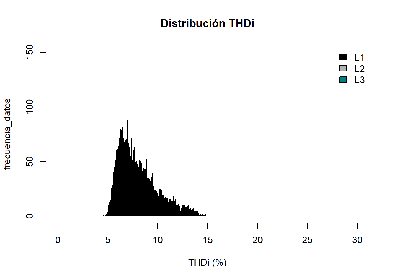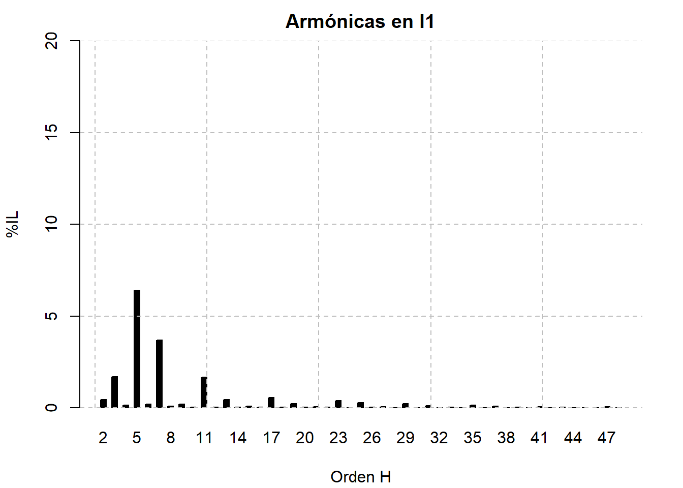 El comportamiento de las armónicas de la corriente sigue un comportamiento normal, donde las magnitudes de la armónica 5ª es la de mayor magnitud, seguida de la 7ª y 11ª, 3ª, 13ª, 17ª, etc., y un promedio de THD del 8.0%.