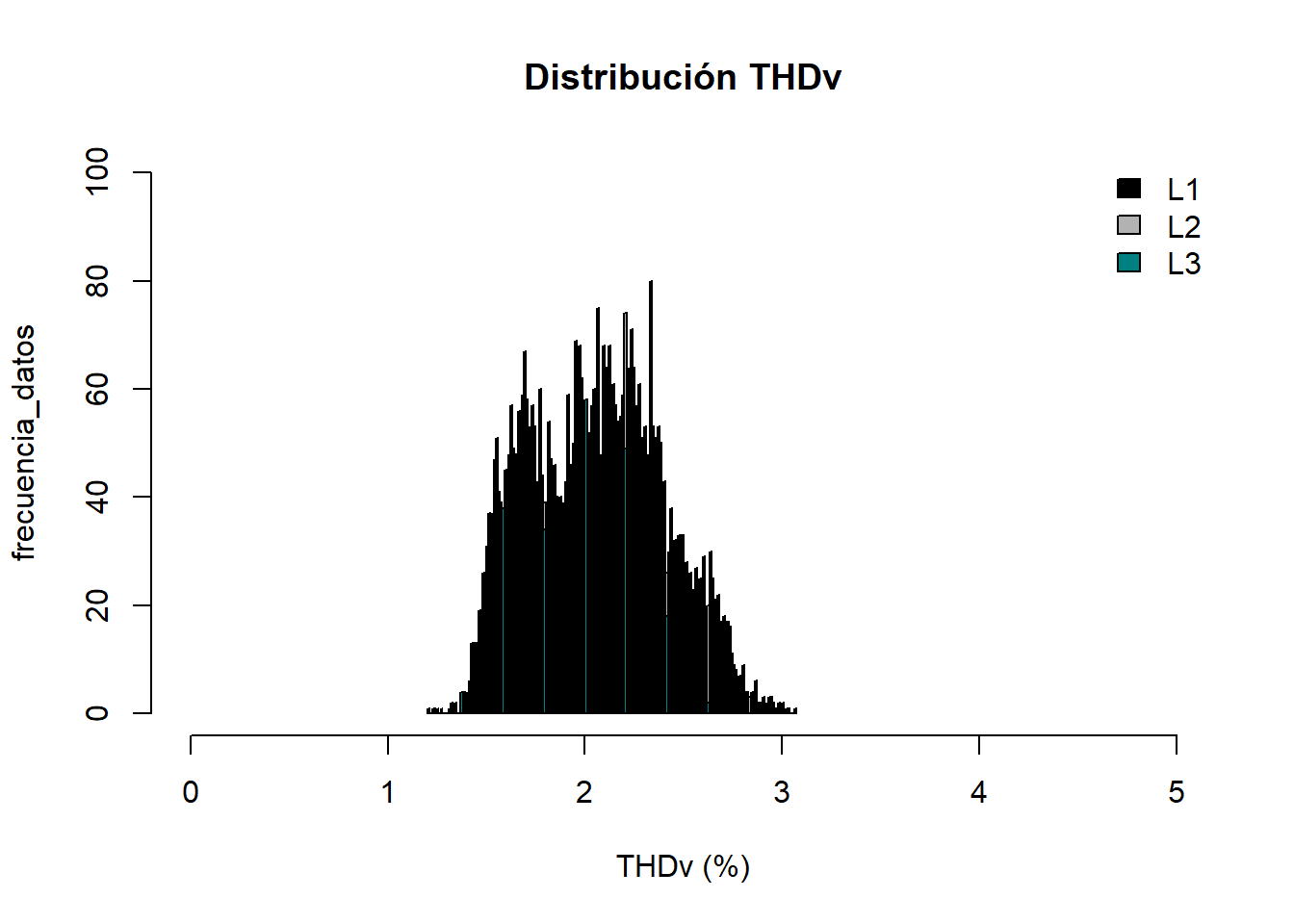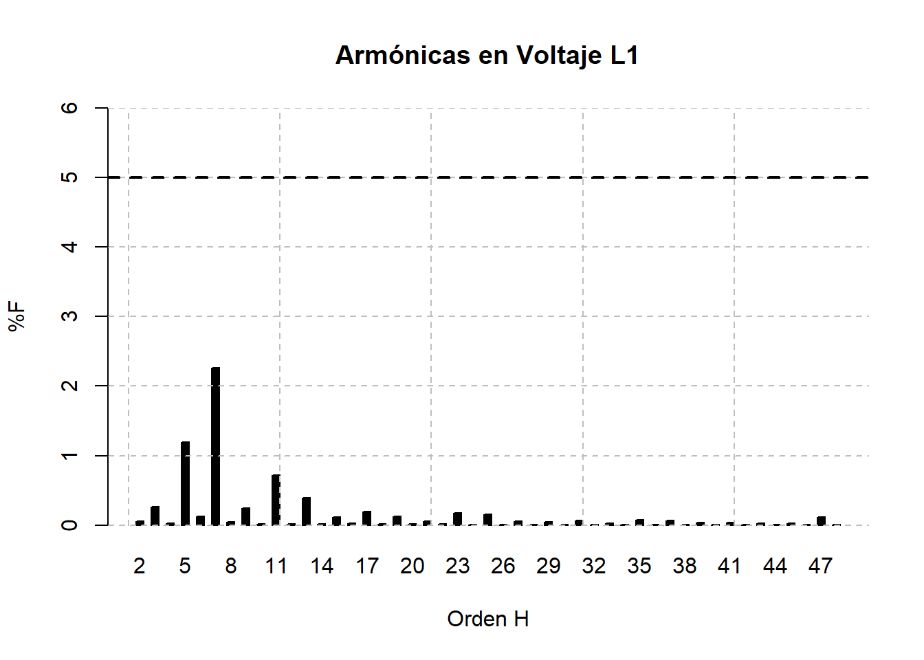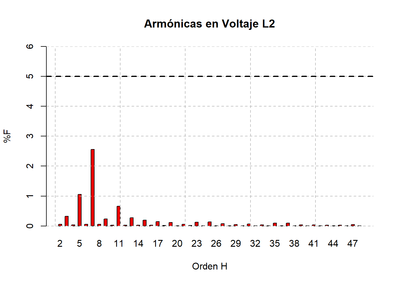 Por otro lado, las armónicas de la tensión siguen un comportamiento diferente, donde la armónica de mayor magnitud fue la 7ª seguida de la 5ª, 11ª, 13ª, 3ª, 9ª, 17ª, 19ª, 23ª, 25ª y 47ª y un THD promedio de 2%. Es importante verificar la armónica 7ª no sea producto de una resonancia, así mismo es importante verificar que las armónicas de orden superior (mayor a la 23ª) no se incrementen en los próximos meses.